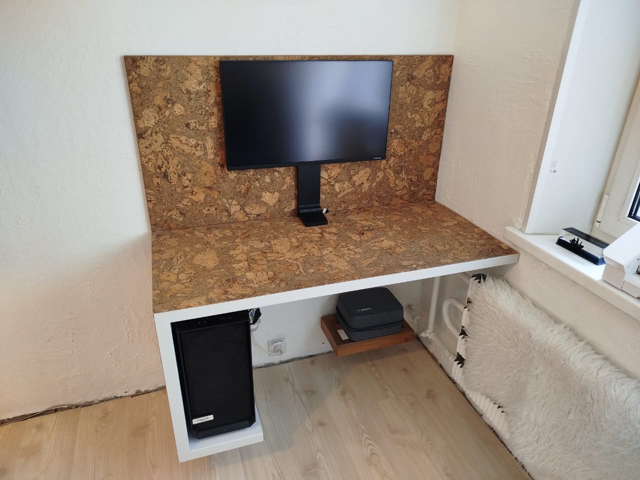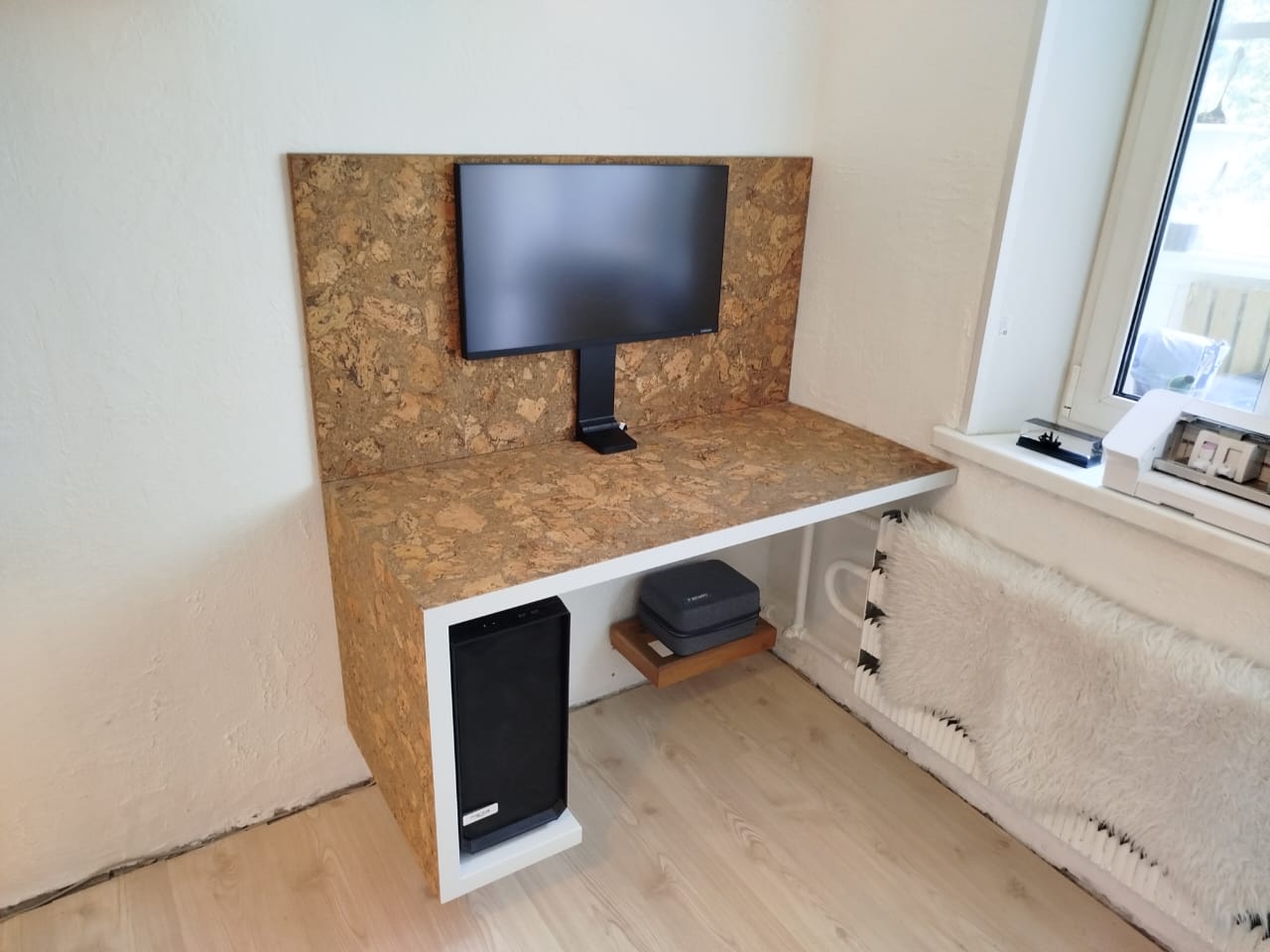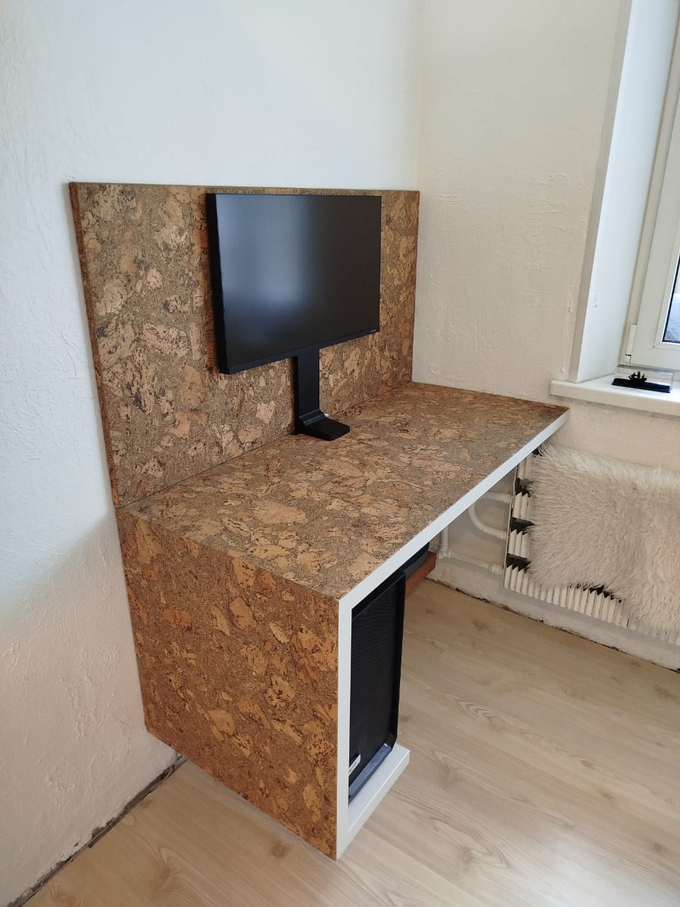 Пробка – безопасна для человека и животных материал, что является отличным выбором для создания эко интерьеров, а разнообразие дизайнов позволяет оформить рабочее компьютерное место в любом эксклюзивном стиле. С помощью пробковых покрытий можно создать не просто компьютерный стол, а облегченную конструкцию с размещением системного блока. В этом случае пробка будет защищать компьютерную технику от попадания пыли внутрь корпуса. Обработка пробкового покрытия натуральным воском обеспечит легкую уборку рабочего места