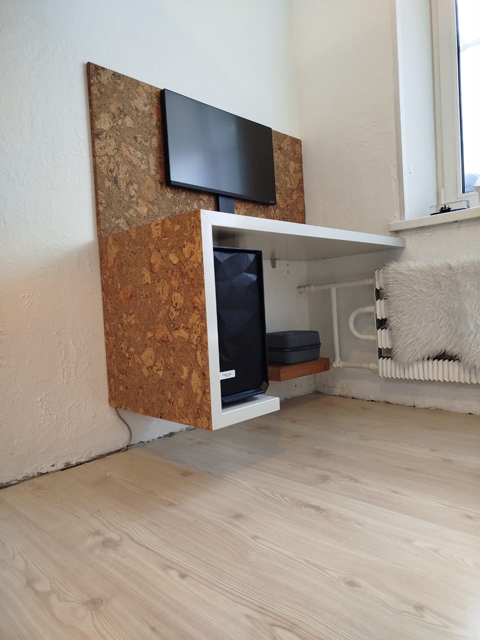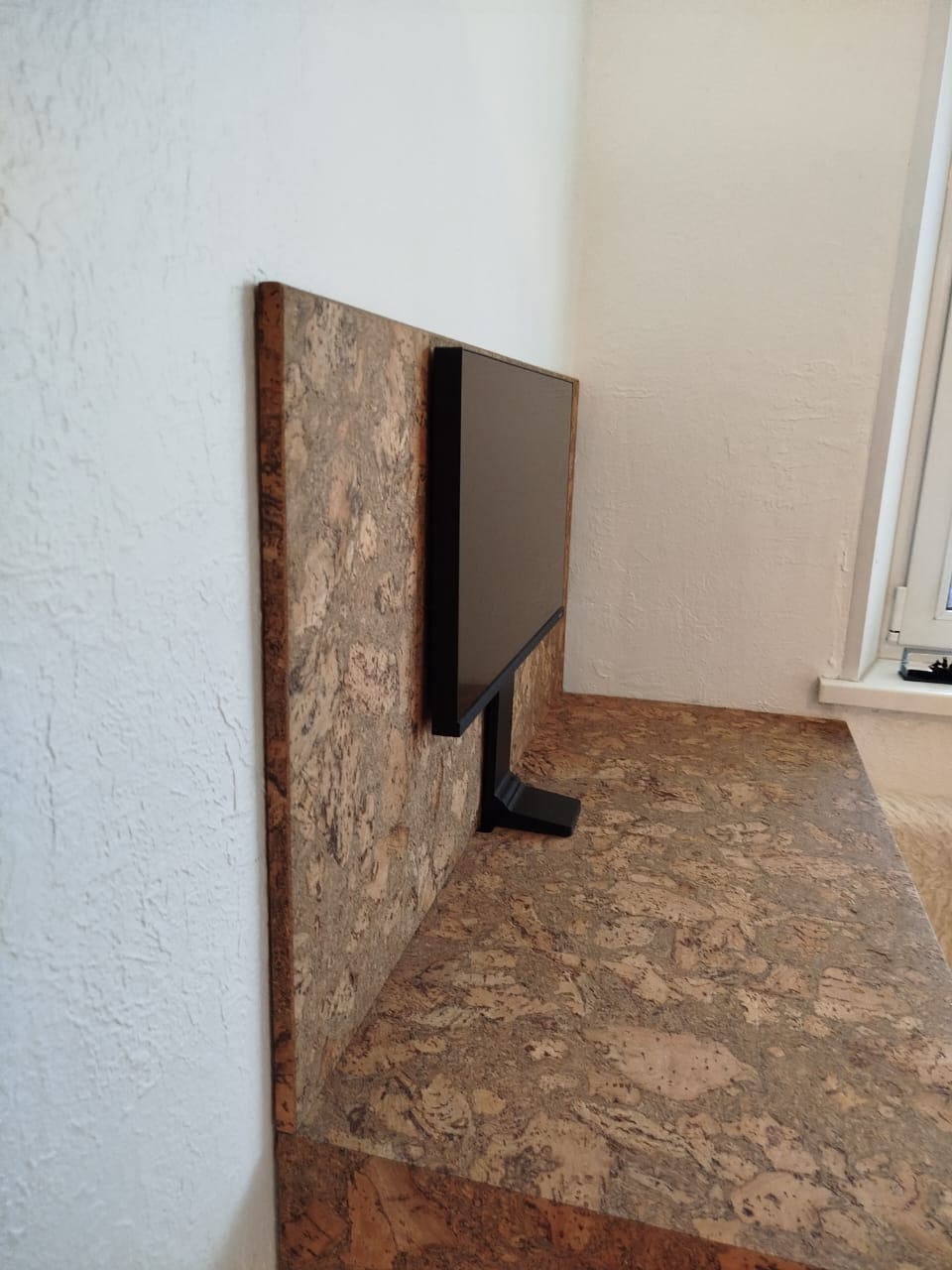 Так же если часть стены, которая прилегает к рабочему компьютерному месту оформить пробкой, то это позволит значительно снизить электростатичность от монитора. Кроме этого данный пробковый участок стены можно использовать как информационную доску с использованием канцелярских кнопок не оставляя следов.